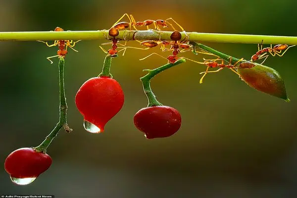 Adhi Prayoga، عکاس آماتور 49 ساله، این عکس های خارق العاده را در یک باغ ثبت کرده است. آقای پرایوگا از شهر ماتارام گفت: 'آنها غذا را به لانه های خود که در میان برگ های درختان انار بود و حدود نیم متر از زمین فاصله داشت، حمل می کردند. وی عنوان کرد: "من از دیدن این مسئله بسیار خوشحال شدم زیرا توانستم سخت کوشی، همکاری، نظم و قدرت آنها را از نزدیک مشاهده و درک کنم."
