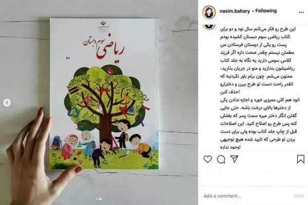 پس از انتشار خبر حذف دختران از روی جلد کتاب ریاضی سوم دبستان، نسیم بهاری، تصویرگر جلد این کتاب در صفحه اینستاگرام خود با اشاره به اینکه «این طرح را چند سال پیش برای کتاب ریاضی سوم دبستان کشیده بودم»، گفت که طرح اصلی هم کلی ممیزی (سانسور) خورد و اجازه ندادند یکی از دخترها بالای درخت باشد!