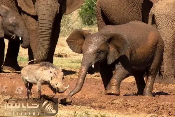 از جذابیت های حیات وحش؛ گراز سمجی که پا رو دم فیل گذاشت بدجووور چَک و لگدی شد