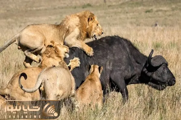از جذابیت های حیات وحش؛ شیر ها داشتن گاومیش رو میخوردن که یهووو یه گله از رفقاش رسیدن