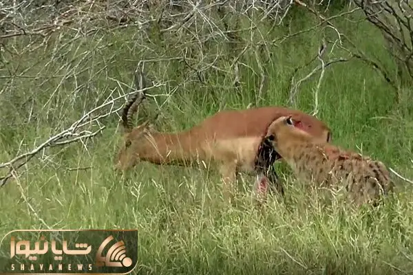 از جذابیت های حیات وحش؛ کفتاری که داشت ایمپالا رو میخورد و تلاش حیوان نصف شده واسه فرار
