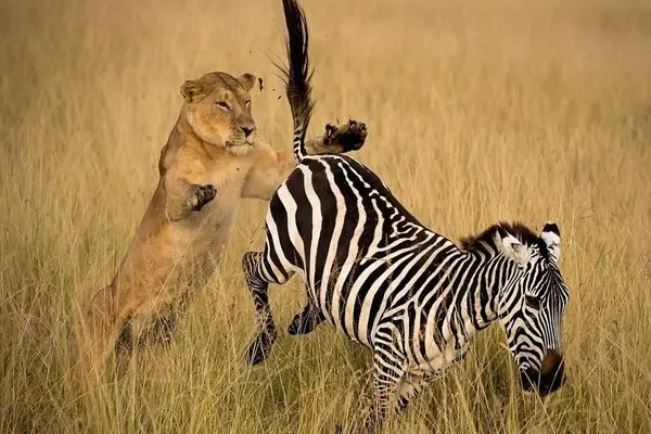 یک بچه گورخر سر به هوا از مادرش جدا شد و به سمت شیر ها رفت چند ثانیه بعد ماده شیر متوجه شد و پس از تعقیب و گریزی کوتاه موفق به شکارش شد.