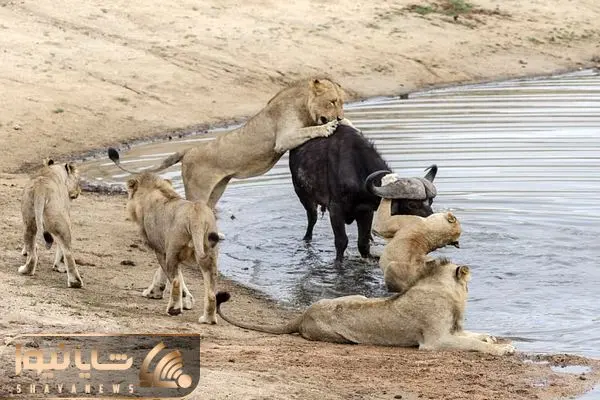 از جذابیت های حیات وحش؛ وضعیت اسفبار بوفالویی که بین شیر های گرسنه و اسب های آبی گیر کرد