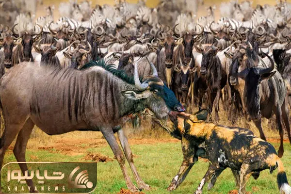 از جذابیت های حیات وحش؛ حمله وحشیانه سگ های وحشی به کل یالدار تنها دل و رودَشو درآوردن