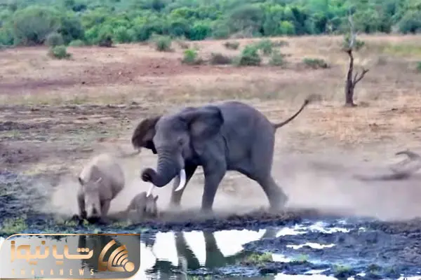 یک کرگدن و بچهاش خیلی خوش شانس بودند که از حمله یک فیل غول پیکر آسیب ندیدند.
