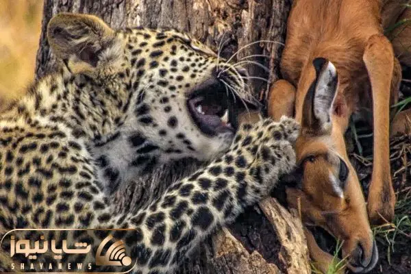 از جذابیت های حیات وحش؛ پلنگ تا چشمش به سگ های وحشی افتاد شکارشو برد بالای درخت قایم کرد
