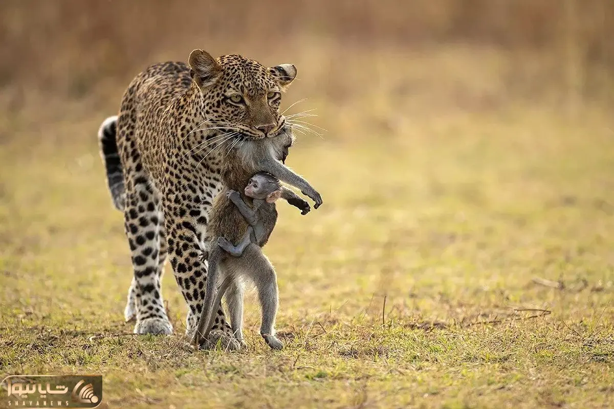 بچه میمونی که بی خبر از همه جا چسبیده به مادر مُردش و پلنگِ خوشحال از شکارش؛ چه دلخراش!