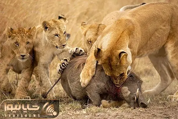 گرازی که تو حال خودش بود و شیر هایی که ناغافل خِفتش کردن؛ اصلا فرصت فرار پیدا نکرد