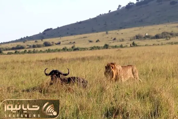 شیر رفته چسبیده به بوفالو اما اون هنوز متوجهش نشده؛ لقمه چرب و چیلی که راحت گیر شیر اومد