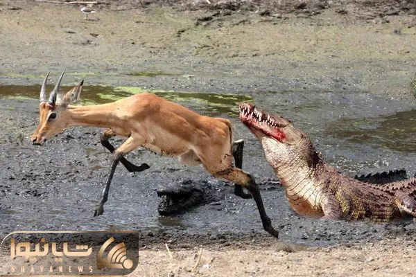 تمساحی که بچه ایمپالا رو گرفته و داره زوری میکشه تو آب؛ بیچاره چه دردی میکشه