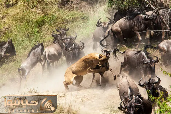 حمله شیر تنهای گشنه به کل های یالدار در حال مهاجرت؛ ببین چطور یکیشون کله پا کرد