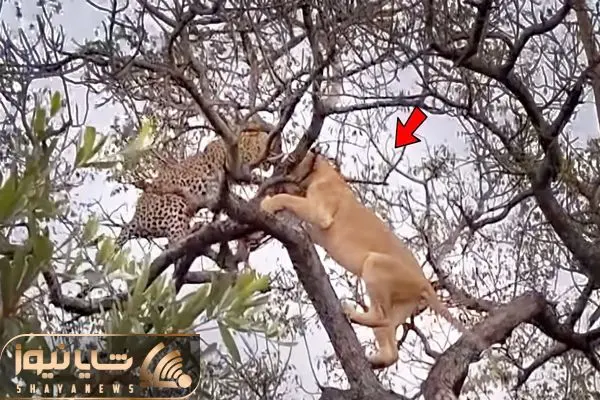دعوای شیر و پلنگ سر لاشه ایمپالا؛ رفتن نوک یه درخت بلند و بدجور افتادن به جون هم