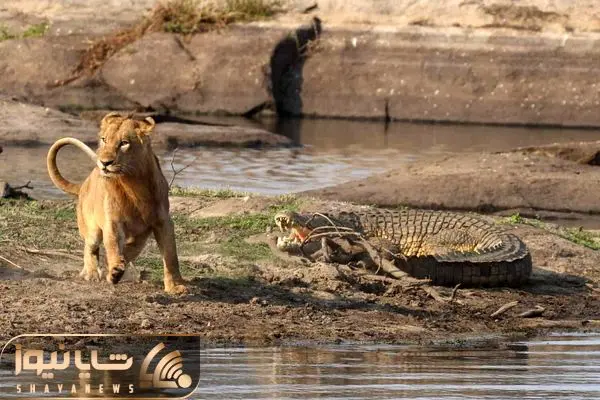 تمساح طمعکار که به غذای شیر ها چشم داشت؛ شیرِ با اینکه ترسیده بدجور دمشو گاز گرفت