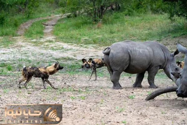 سگ های وحشی که کرگدن رو دوره کردن اما جرئت نزدیک شدن بهشو ندارن؛ شاخش چی شده؟