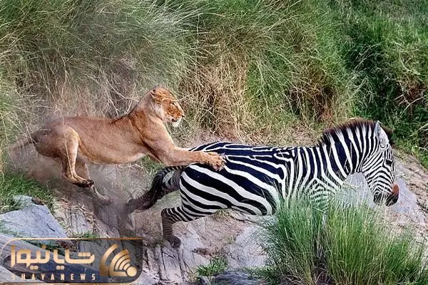 از جذابیت های حیات وحش؛ شیر خونخوار به جون گورخر تنها افتاده و بیخیال گاز زدن نمیشه!