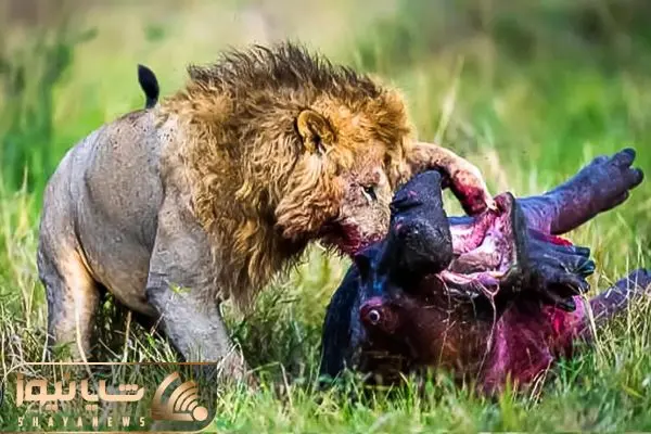از جذابیت های حیات وحش؛ نگاه بی تفاوت اسب های آبی به اسب آبی ای که اسیر شیر ها شده