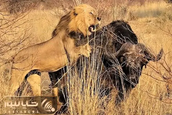 از جذابیت های حیات وحش؛ ببینید شیر چطور انقدر محکم بوفالوی 1 تنی رو کوبوند زمین