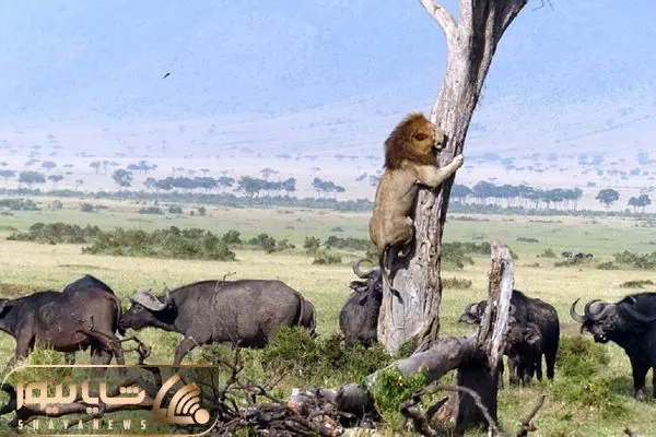 از جذابیت های حیات وحش؛ دیوانه بازی بوفالو ها کاری کرد که شیر عین سوسک چسبید به درخت