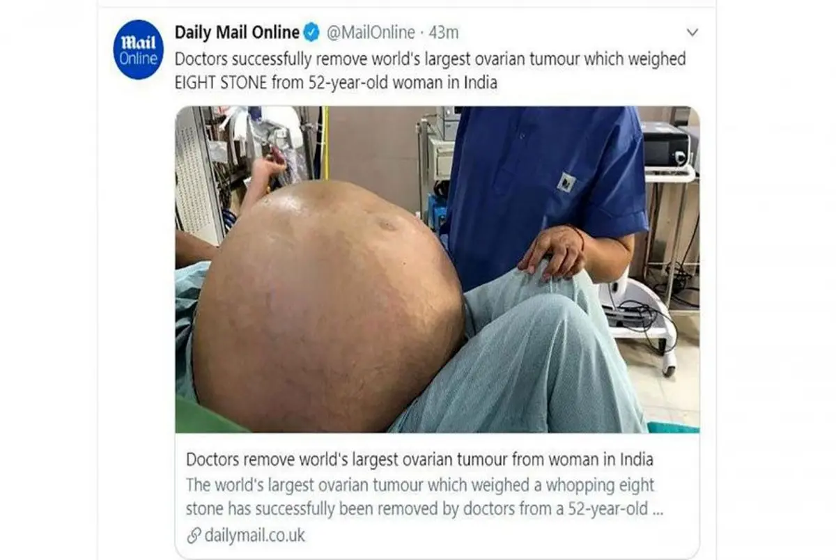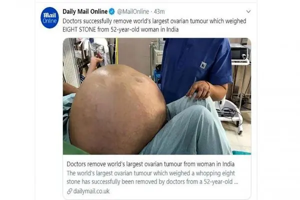پزشکان بیمارستانی در هند طی یک عمل جراحی سنگین موفق شدند تومور 50 کیلویی را از شکم یک زن 52 ساله خارج کردند.