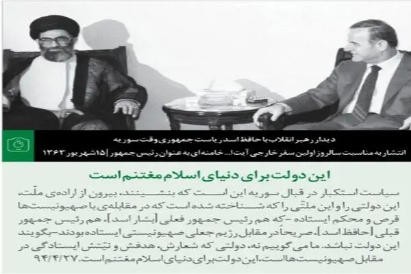 حضرت آیت الله خامنهای در اولین سفر خارجی خود به عنوان رییس جمهور به سوریه رفتند و با حافظ اسد، رییس جمهور وقت این کشور دیدار کردند.