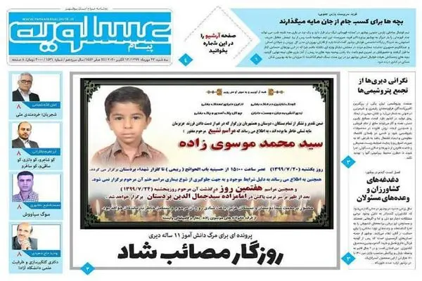 آگهی ترحیم محمد موسوی زاده دانش آموز ۱۱ساله بوشهری در صفحه اول روزنامه پیام عسلویه چاپ بوشهر منتشر شد.