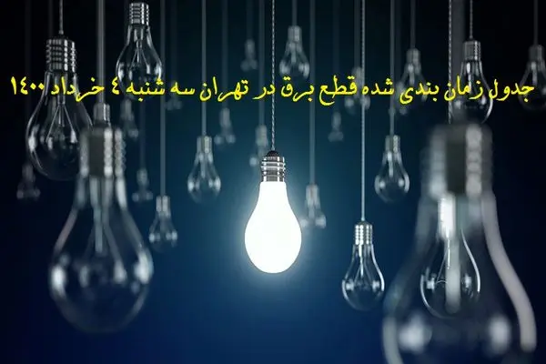 برنامه احتمالی قطعی برق و خاموشیهای استان تهران در روز سه شنبه 4 خرداد ماه 1400 اعلام شد.