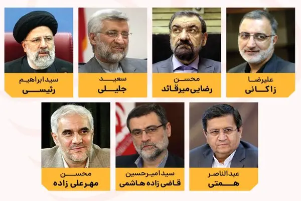 سعید جلیلی، محسن رضایی، ابراهیم رئیسی، علیرضا زاکانی، قاضیزاده هاشمی، محسن مهرعلیزاده و عبدالناصر همتی گزینه های نهایی انتخابات 1400 هستند.