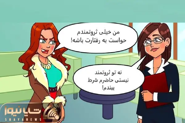 زن سمت راست یک کارمند ساده است. او به طور کلیشه ای فکر می کند آدم های ثروتمند نباید جواهرات اغراق آمیز بپوشند و یا بی ادبانه رفتار کنند در حالی که منش و اخلاق ربطی به جیب افراد ندارد. زن سمت چپ استایل هزار رنگ دارد و با اصول ست آشنا نیست با این حال این دلیل نمی شود ثروتمند نباشد، اتفاقا همه افراد پولدار خوشتیپ نیستند. زن کارمند واقعیت را نفهمیده است.