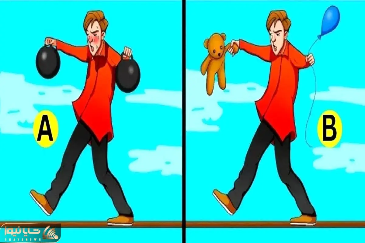 مرد B به دلیل توزیع نامتقارن وزن یعنی بادکنک سبک در یک دست و خرس نسبتا سنگین در دست دیگه اش تعادلش رو از دست میده.