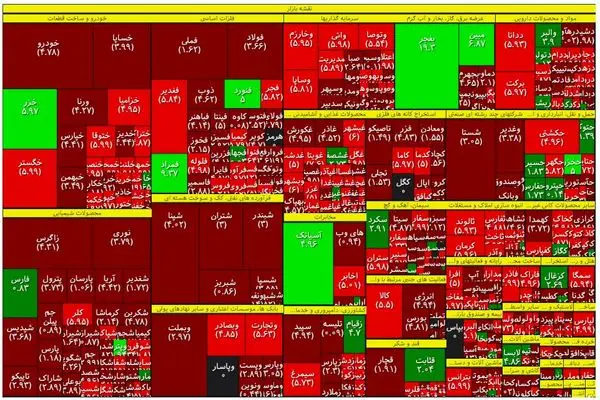 در معاملات امروز شاخص کل بورس تهران ت این لحظه سقوط سنگین 27 هزار واحدی داشته است و نقشه بازار سهام به رنگ خون در آمده است.