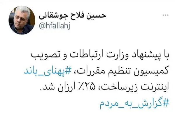 معاون وزیر ارتباطات در توئیتر خود از ارزان شدن ۲۵ درصدی پهنای باند اینترنت زیرساخت خبر داد. حسین فلاح جوشقانی، معاون وزیر ارتباطات در توئیتر خود از ارزان شدن ۲۵ درصدی اینترنت زیرساخت خبر داد. مدتی قبل وزیر ارتباطات اعلام کرده بود در صورت افزایش پهنای باند، قیمت اینترنت، کاهش خواهد یافت. به نظر می‌رسد با این مصوبه، اولین گام برای کاهش تعرفه اینترنت برداشته شد.