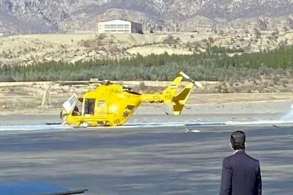 هلیکوپتر اورژانس زرد رنگ در ایلام متعلق به شرکت آوای سلامت که قصد اعزام به ماموریت دارد.
