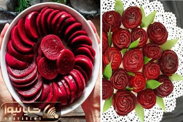 اگر قصد دارید برای شب یلدا لبو بپزید، می تونید بعد از اینکه چغندر قرمز کاملا پخت اون رو به شکل حلقه های نازک برش بزنید، سپس اون ها رو به شکل گل رز داخل دستتون شکل بدید و با خلال دندون محکم کنید.