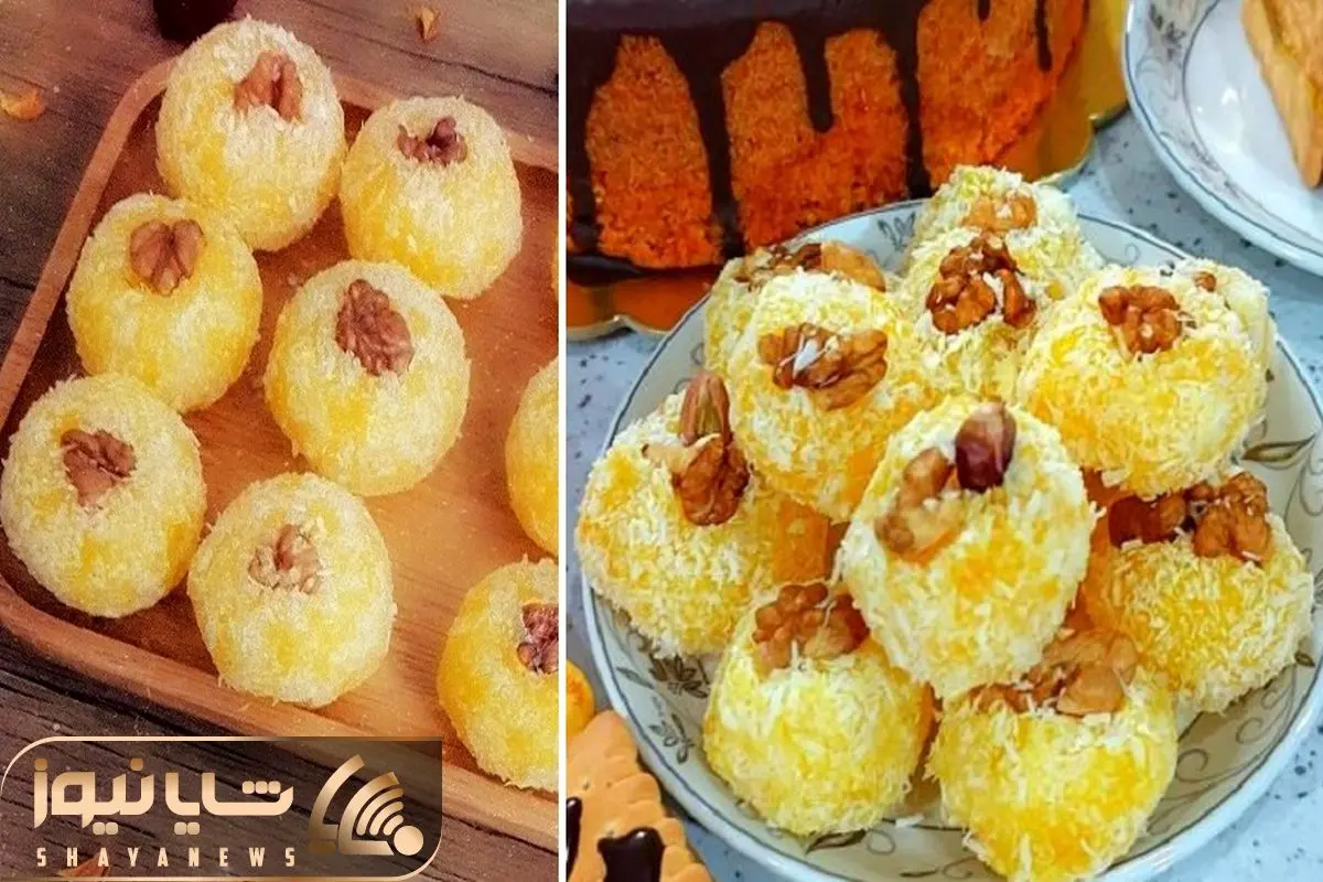 کف دیس یا سطح یک ظرف رو نایلون پهن کنید و روی اون پودر نارگیل بریزید. سپس مواد باسلوق زعفرونی رو داخل قیف ریخته و داخل ظرف به اندازه گردو، پایپ کنید. بعد با دست تون حالت بدید و تمام سطح باسلوق رو پودر نارگیل بزنید و در آخر روی اون نصف مغز گردو بذارید.