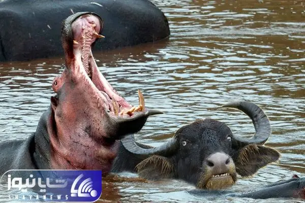 از جذابیت های حیات وحش؛ وقتی اسب آبی کله بوفالو رو میکنه تو دهنش!