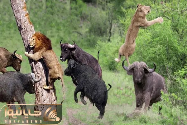 از جذابیت های حیات وحش؛ وقتی شیر که سلطان جنگله از ترس فرار میکنه بالای درخت