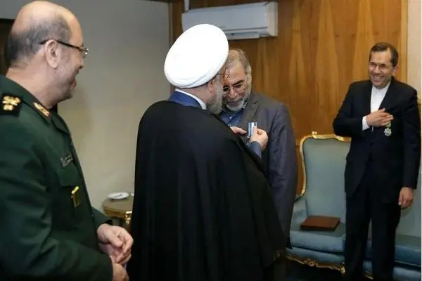 یکی از صدها ناگفته برجام، تصویری از حسن روحانی در حال نصب نشان خدمت بر سینه شهید محسن فخری ‌زاده است.