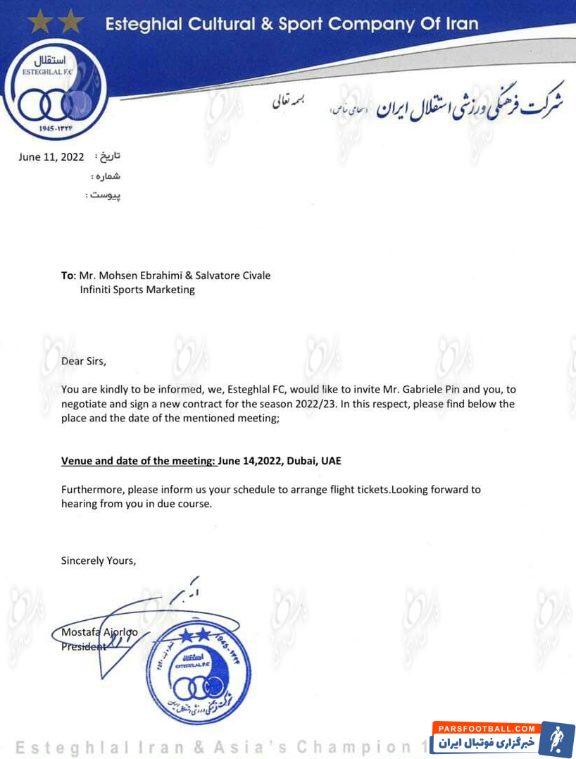 این موضع رسمی روز یک شنبه از طریق ایمیل به باشگاه اعلام شده، با این حال نمایندگان استقلال روز گذشته در دبی، مذاکراتی را هم با وکیل پین انجام دادند که در این جلسه باز هم بر ادامه کار به عنوان سرمربی تاکید شده است.