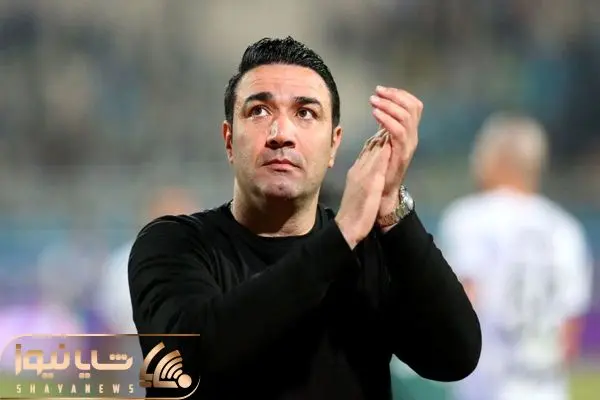 سرمربی تیم استقلال با پیراهن سُرمهای رنگ در کنار زمین دیده میشود.