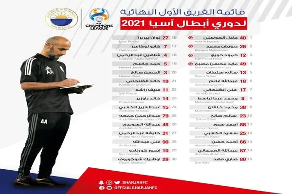 تیم فوتبال الشارجه که میزبانی گروه دوم از رقابت های لیگ قهرمانان آسیا را برعهده دارد، در فاصله 3 روز تا آغاز رسمی مرحله گروهی این رقابت ها، لیست خود را برای شرکت در این رقابت ها اعلام کرد.