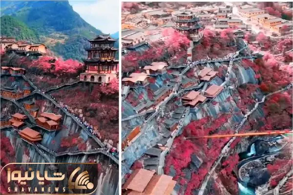 یکی از روستاهای کشور چین به صور طبقاتی و روی صخرهها ساخته شده است و سرتاسر آن را درختانی با برگهای صورتی فرا گرفته است.