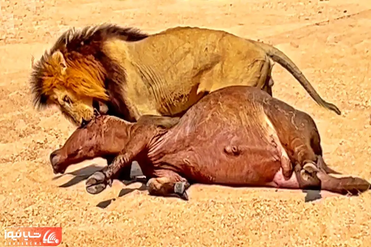 از جذابیت های حیات وحش؛ شیر نر بزرگ یه کل رو خفه کرد و جلوی رفقاش خرکش کرد!