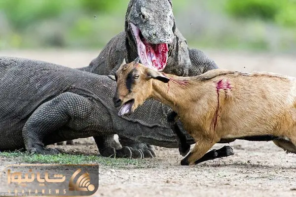 اژدهای کومودو به بز که در حال استراحت بود یورش می بره و در حالی که هنوز زنده بود شروع می کنه به بلعیدنش اما اینقدر بزرگ بود تو دهنش جا نمیشه