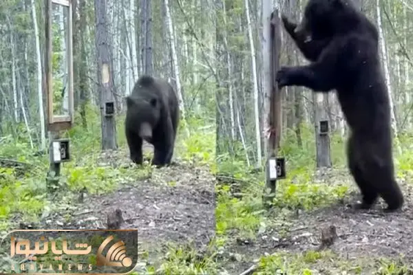 ویدیویی بامزه از خرسی که در جنگل برای اولین بار خودش را در اینه میبیند واقعا وحشت زده می باشد