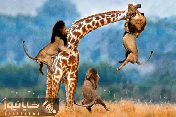 از جذابیت های حیات وحش؛ ببینید این شیرها برای شکار چطور از گردن زرافه آویزون شدن