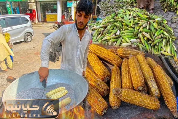 غذای خیابانی؛ ببینید بلال معرکه ای که این پسر اهل پیشاور تو نمک و رو هیزم کباب میکنه
