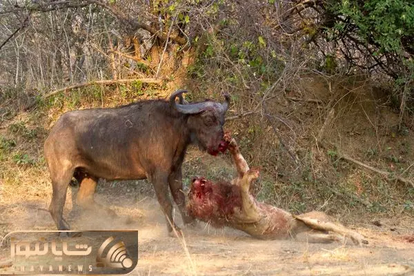 از جذابیت های حیات وحش؛ بوفالو یه شاخ زد شیر رو با مخ کوبوند زمین ضربه مغزی شد