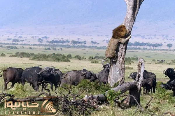 از جذابیت های حیات وحش؛ شیر از ترس بوفالو ها یجوری رفته نوک درخت که ببینی دلت کباب