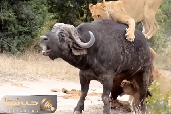 از جذابیت های حیات وحش؛ شیر هایی که از پشت پاهای بوفالو رو کشیدن و محکم زمین زدنش