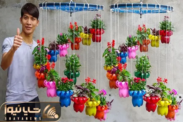 ایده های خلاقانه؛ آویز مارپیچ پر از گل با بطری های پلاستیکی دوغ و نوشابه واسه تراس